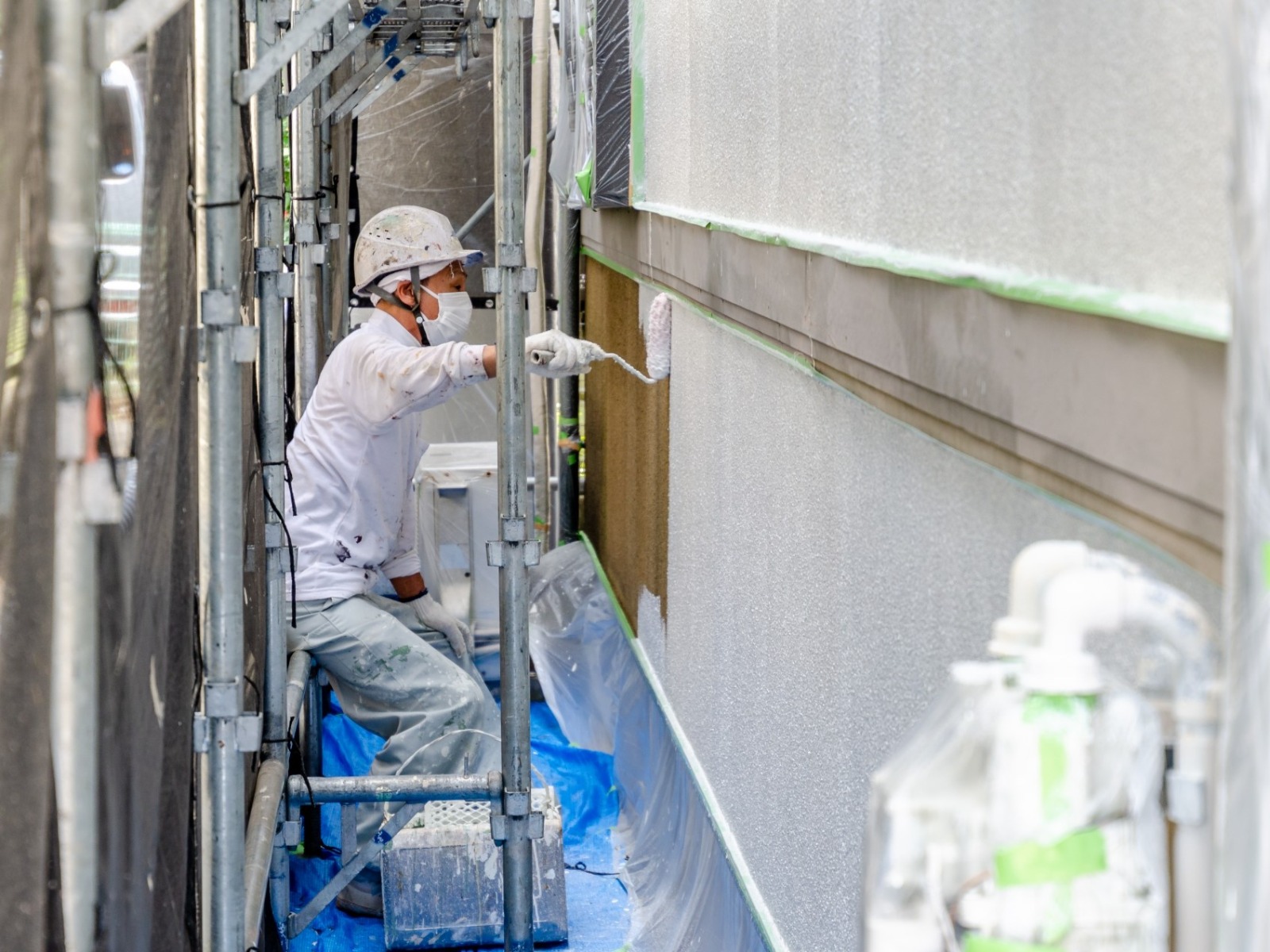 窓やベランダなど、塗装面以外への塗料の飛散と付着を防ぐため、ビニールで対象物を覆って保護します。